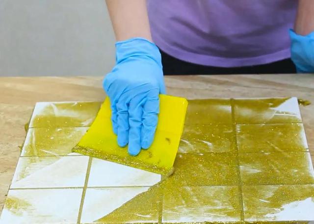 5. 等待美縫劑固化之后,可以進行鏟膠,貼有美紋紙的瓷磚,需要在壓完縫后將美紋紙撕掉,不用等到美縫劑固化。