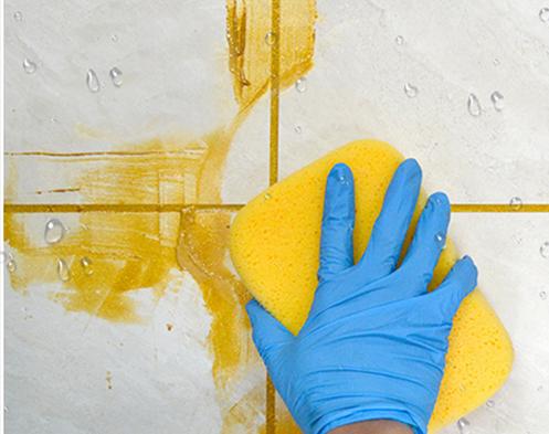 4. 表面彩砂刮完之后,用濕潤的海綿以打轉的方式清洗瓷磚,再將海綿清洗干凈擰干,將瓷磚表面多余的水分擦干。