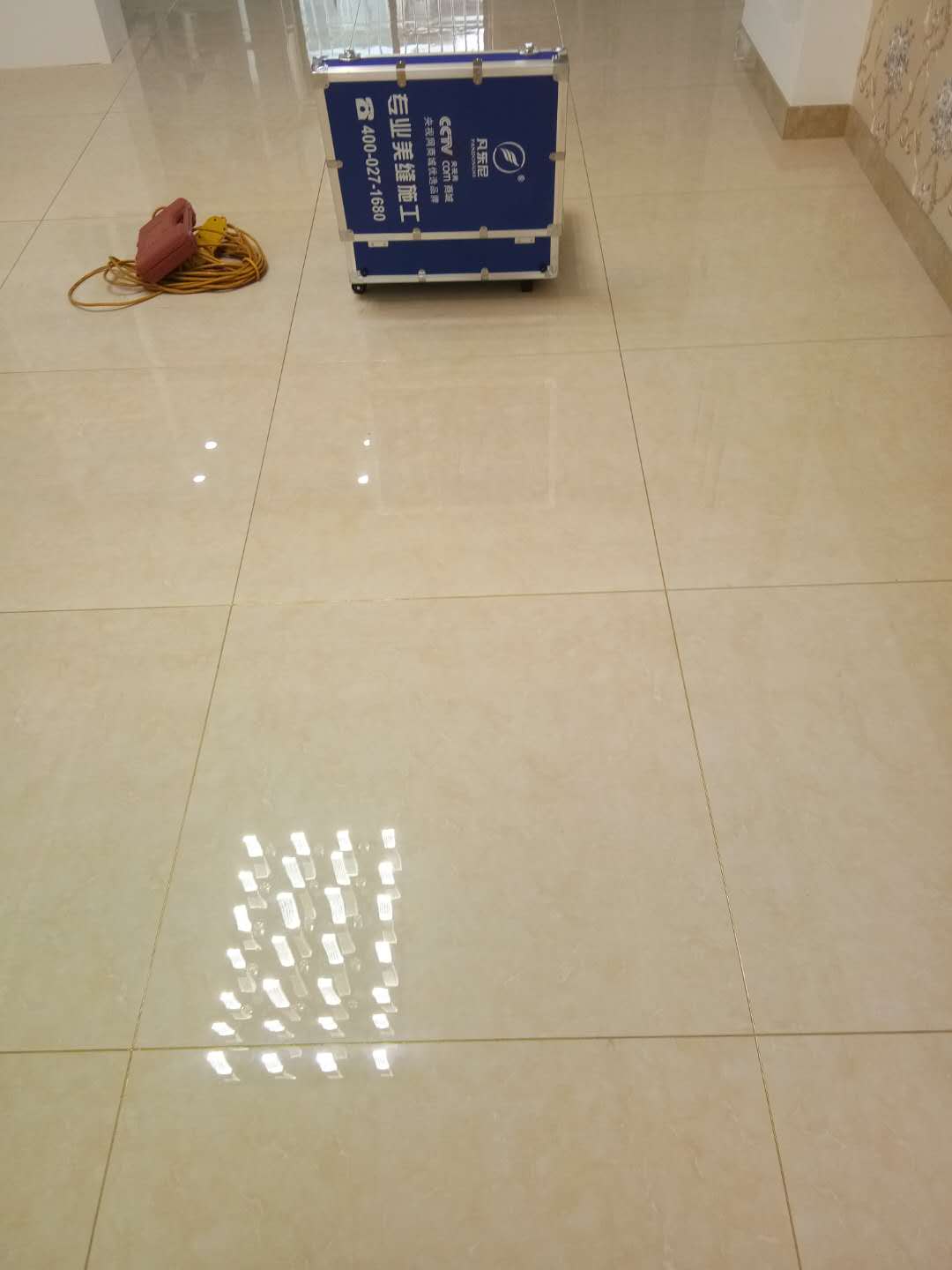 2.大家在施工前應將瓷磚地面打掃干凈:清潔瓷磚縫隙內部的粉塵,使吸塵器或者掃將掃干凈,需要保證瓷磚縫隙內不潮濕;沒粉塵,顆粒。