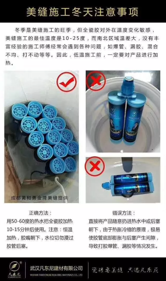 冬天南方城市沒有集體供暖,室內外潮濕現象重于北方。冬天潮濕陰雨的環境下美縫,施工時一定要注意關好窗戶,并且需要注意兩個問題,一是清縫時需仔細觀察每厘米清理出的雜物是否潮濕,如果有潮濕的縫隙,必須用專業的高壓機(電吹風)吹凈吹干;二是余料固化清理的時間,需要靈活把控。最好在晴天施工。