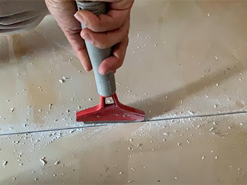 壓縫一般在打完膠的15分鐘左右進行,一定要用壓縫球或者刮板壓縫,不同工具的壓縫效果也不一樣,可以根據自己的需求來選擇。但是不可以直接使用手,美縫劑沾在手上很難清洗干凈。壓縫一定要使用均勻的力度,平緩的一次壓過,只有交點的地方才能進行多次修復。